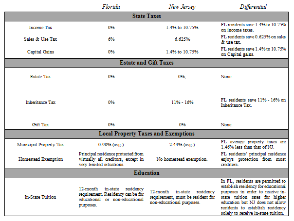 Now more than ever, people are contemplating changing their state residency. We are frequently approached by clients seeking to relocate to Florida for financial reasons but they do not always understand the financial benefits or the process of establishing Florida residency. To help you decide whether a permanent move from New Jersey to Florida is right for you, this article explores the benefits that Florida residents enjoy, the process of becoming a Florida resident and the costs associated therewith.
